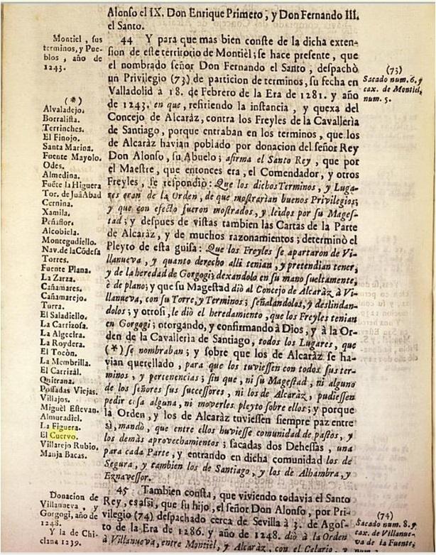 Este escrito de Chaves Bernabé se sustenta precisamente en el documento de partición de términos entre el Concejo de Alcaraz y la Orden de Santiago, donde por privilegio del rey Fernando III el Santo, dado en Valladolid, el 18 de febrero del año 1243, se le adscriben al Campo de Montiel, entre otros, los siguientes pueblos: Criptana, Posadas Viejas, Villajos, Miguel Esteban, Almuradiel, La Figuera, Villarejo Rubio, El Cuervo y Manjavacas (estos dos últimos integrados más tarde junto a La Mota, para formar Mota del Cuervo), pueblos que luego formarían parte del Común de la Mancha y como tales pertenecientes a la Orden de Santiago.
