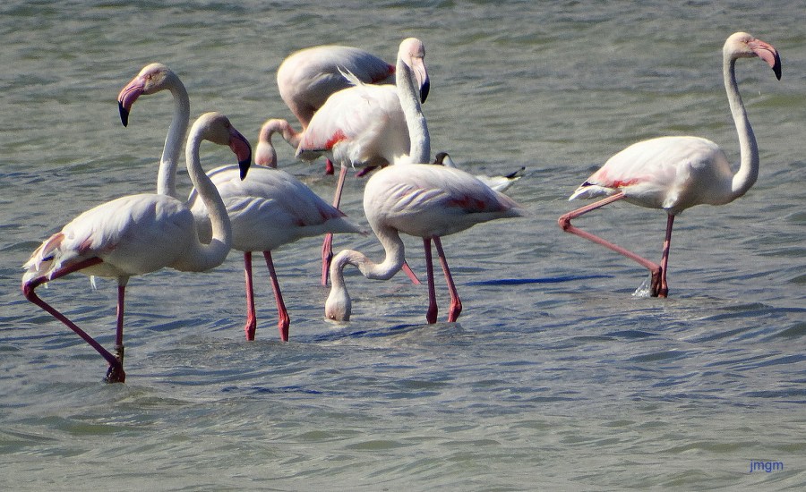 En primer plano, junto a la orilla, podemos ver abundante Castañuela (Bolboschoenus maritimus o Scirpus marítimus) es una especie de planta acuática que pertenece a la familia Cyperaceae. Se encuentra en las orillas de ríos y humedales, frecuentemente en aguas salinas o mesosalinas. En segundo plano vemos numerosos flamencos y otras aves migratorias que pueblan la Laguna de Manjavacas. (foto y comentario jmgm).