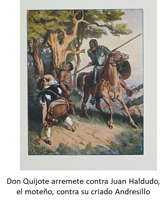 En el episodio del moteño Juan Haldudo (el rico, el vecino del Quintanar), que estaba apaleando a su criado Andresillo y la contundente defensa de Don Quijote, el apaleado describe las consecuencias posteriores:
