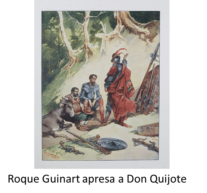 (*) Don Quijote y Sancho son capturados en Barcelona por el bandolero Roque Guinart . Junto a ellos vienen unos peregrinos que iban a embarcarse en Barcelona. Cuando a toda la comitiva les hacen entregar sus dineros, a los peregrinos les bonifican con diez escudos y al escudero otros diez. Es curioso cómo este personaje de Roque Guinart si es considerado como real por el académico Martín de Riquer y en cambio muchos cervantistas no aceptan los personajes reales en el resto de la obra… Como Juan Haldudo, los alcaides de Mota del Cuervo, el morisco Ricote…