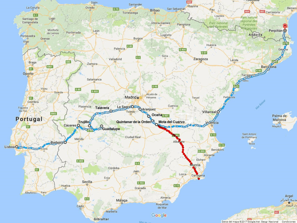 En 1581 Tras la anexión de Portugal a España, Cervantes se desplazó a Lisboa, siguiendo la corte de Felipe II. A su vuelta a Madrid en 1582 transita por el camino de peregrinación a Guadalupe, por el que hace “recorrer” a sus protagonistas en el Persiles, pasando por Quintanar y la Mota, hasta Valencia. Una ruta que coincide con los caminos descritos por Juan de Villuga.