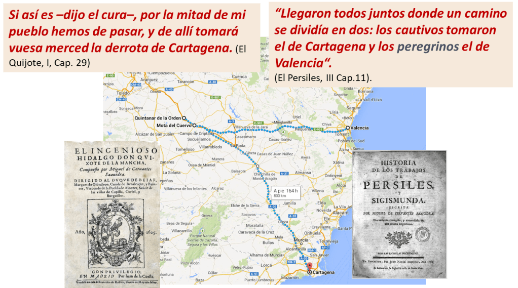 Vemos en esta imagen cómo Cervantes se refiere en el Quijote y en El Persiles la misma bifurcación en Mota del Cuervo.